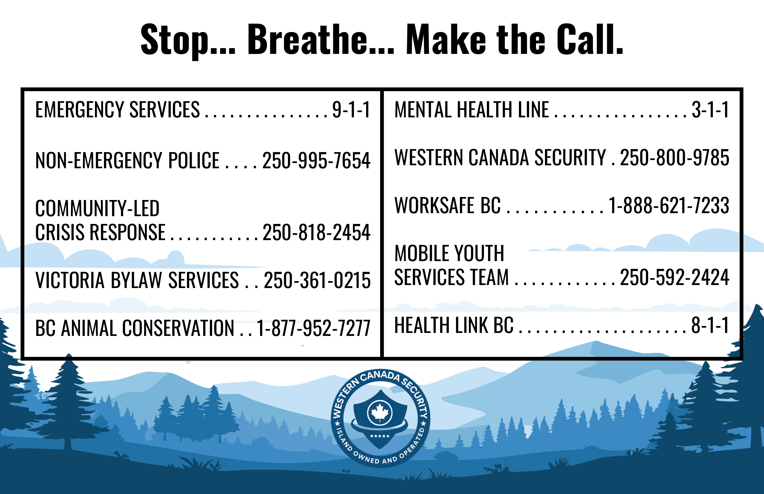 Smart businesses don’t ask “what should we do if something goes badly?”; they ask “what will we do when things go badly?” Maybe that day never comes. There will still be ample benefits from planning: peace of mind and strong morale from a team that knows their employer is looking out for them. We are looking out for them, too. Our goal is for people in our region to see Western Canada Security as a 24/7 hub for everything related to security. That’s why we’re included in the emergency contact Cheat sheet we’ve provided. It is geared mainly toward workplaces in Victoria’s Capital Regional District. However, if you’re calling from another region, dispatchers will redirect your call accordingly.